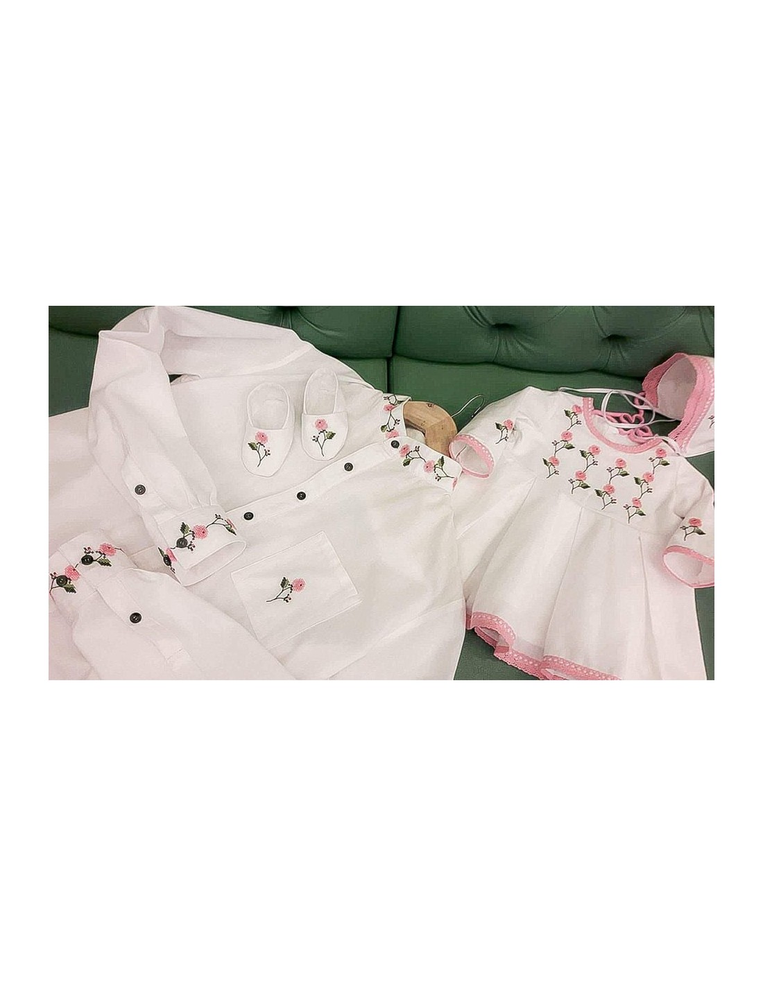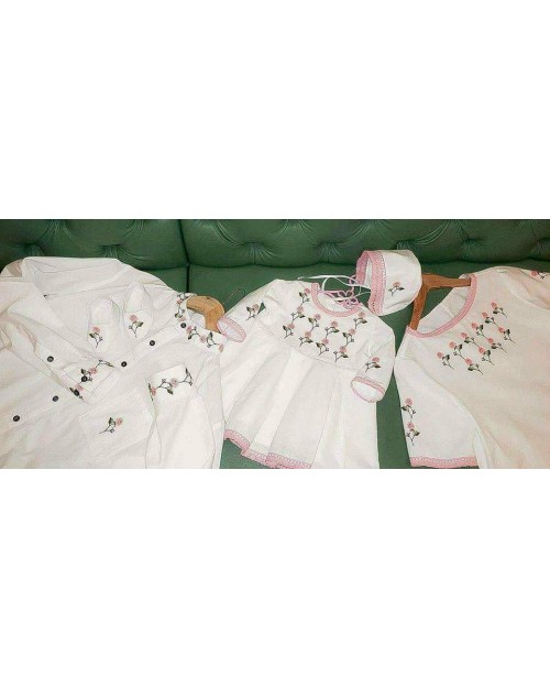 Setul include străițe pentru fetiță: rochiță, scufiță, botoșei, bluză damă, cămașă adult. Rochița pentru bebeluș se închide cu nasturi la spate.