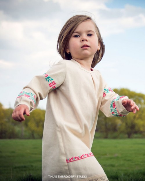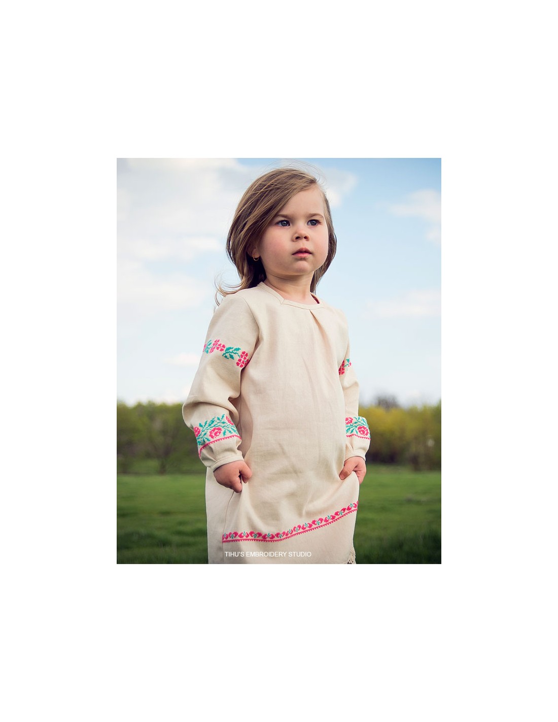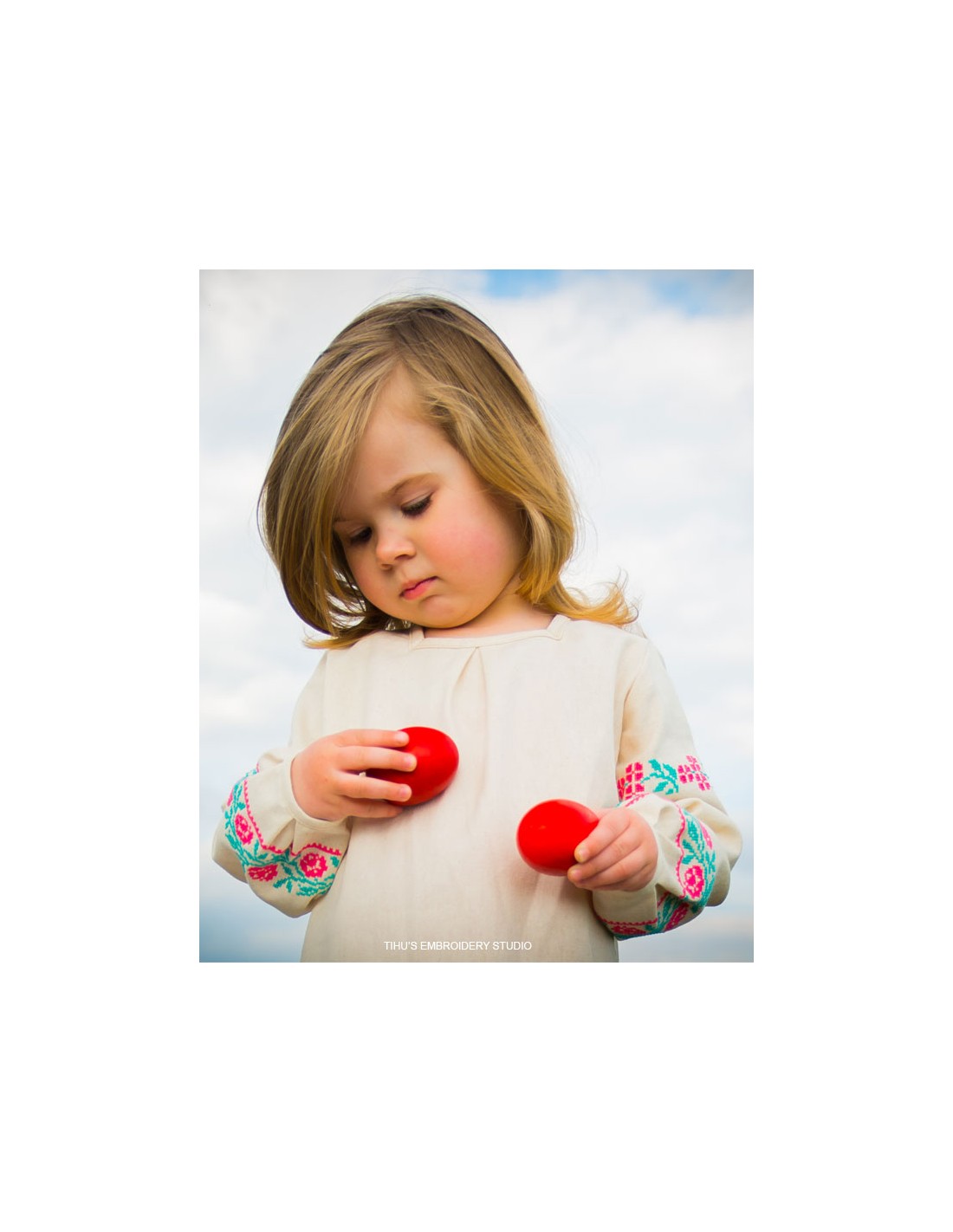 Rochița poate fi creată din pânză naturală, tradițională românească, sustenabilă, bumbac, borangic sau cânepă, pânze prietenoase ecosistemului și corpului, antialergică și aerată care lasă pielea să respire. Broderia e lucrată manual.