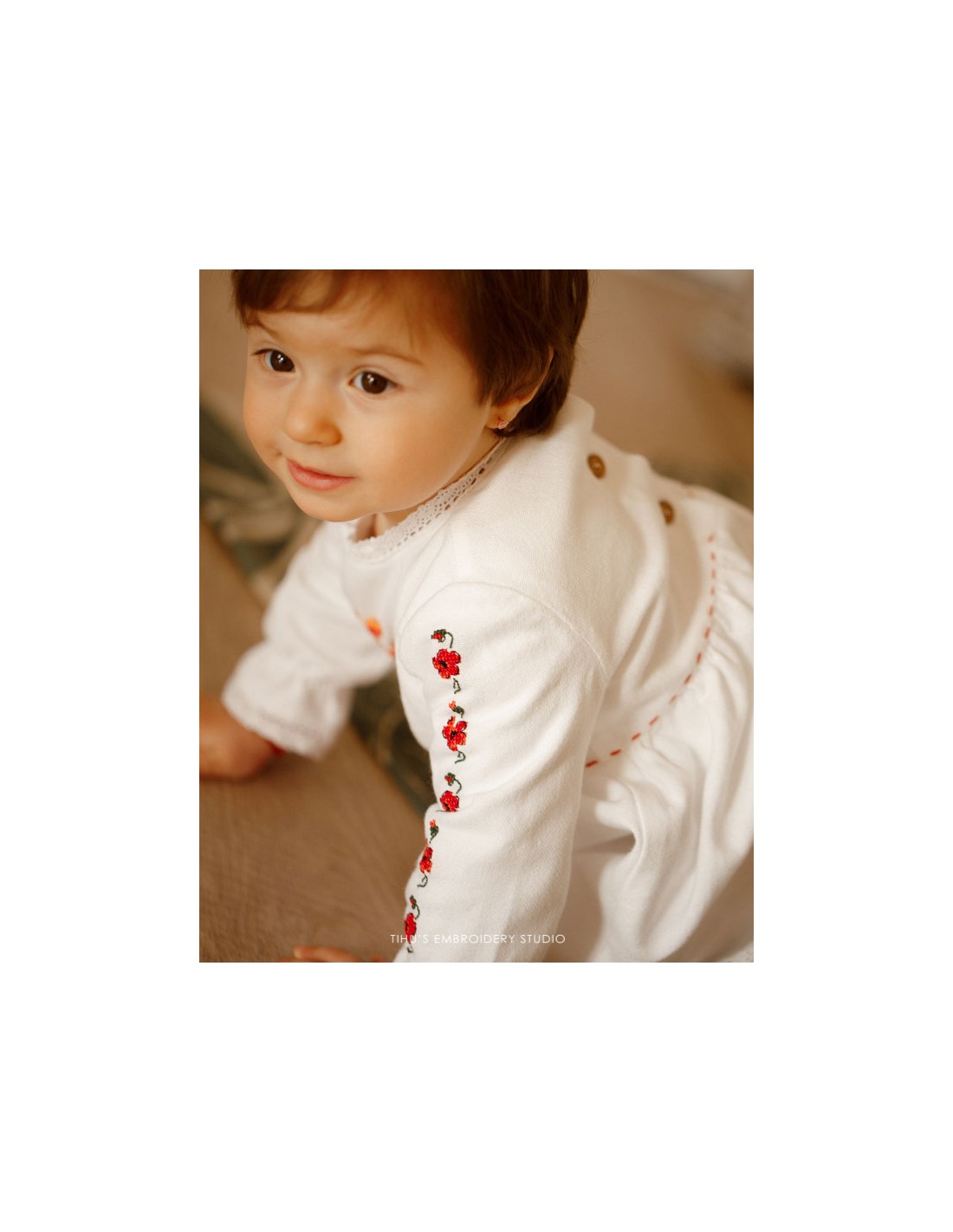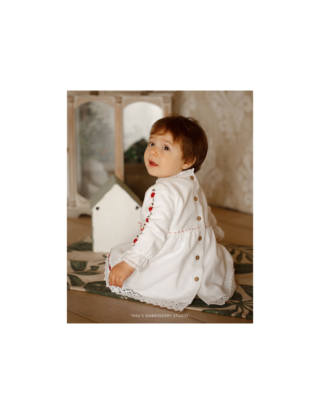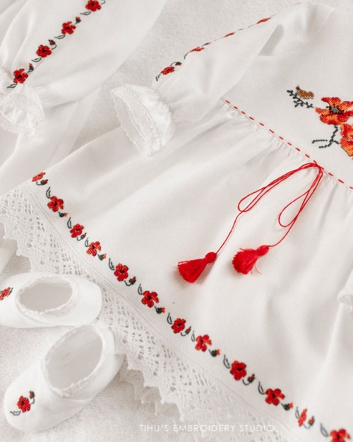 Străițele de botez sunt create din pânză naturală, tradițională românească, sustenabilă, 100 % bumbac, prietenoasă ecosistemului și corpului bebelușului, antialergică și aerată care lasă pielea să respire. Setul de străițe conține: rochiță, scufiță, botoșei. Rochița se închide cu nasturi la spate. Botoșeii au șiret. Fiecare articol din componența setului se poate achiziționa și separat.