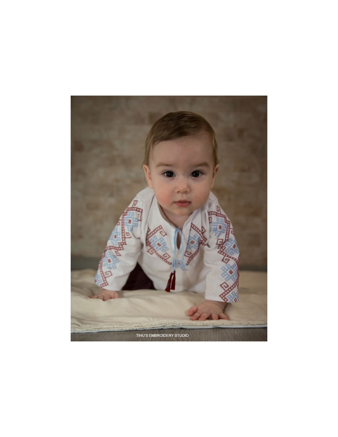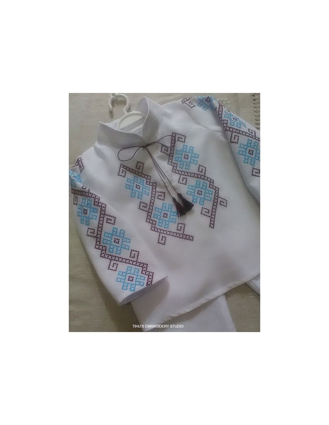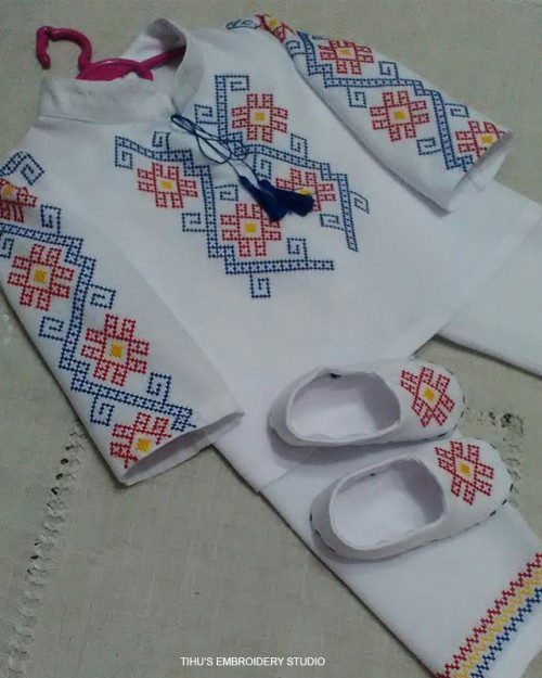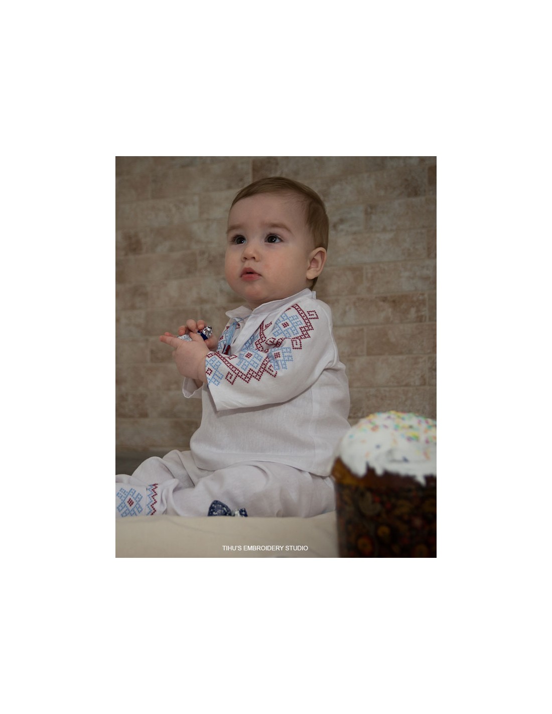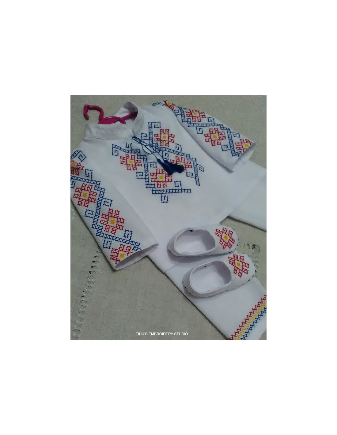 Setul de străițe conține: cămășuța cu guleraș stei, pantaloni și boteșei, brâu, căciuliță. Cămășuța se închide cu nasturi la spate.