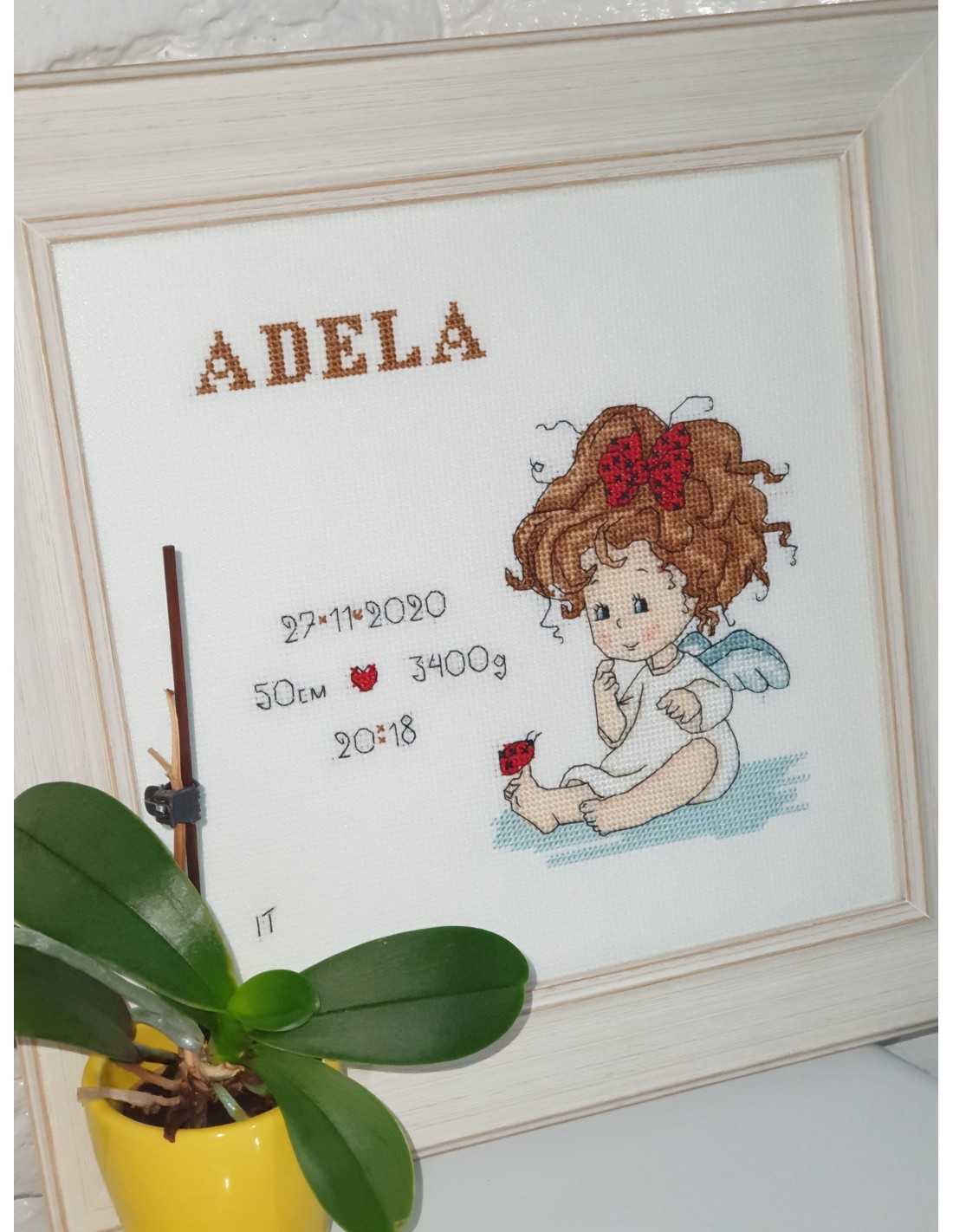 Tabloul este personalizat prin brodare manuală cu datele solicitate (data de naștere, ora, greutatea bebelușului, înălțime etc).