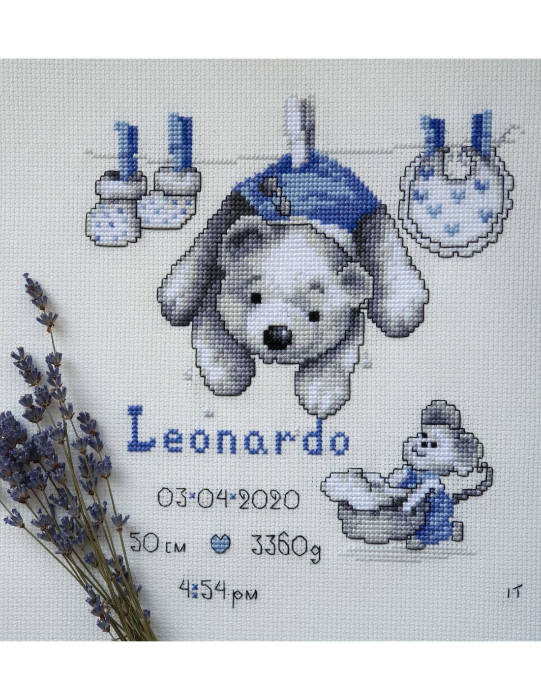 Tabloul este personalizat prin brodare manuală cu datele solicitate (data de naștere, ora, greutatea bebelușului, înălțime etc).