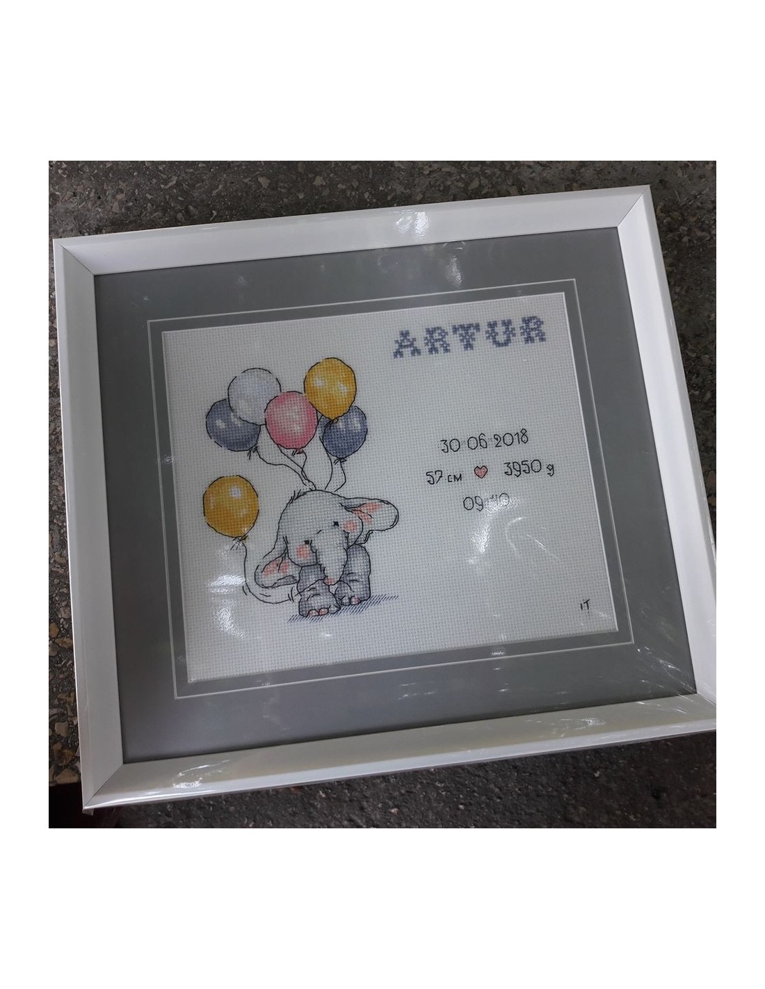 Tabloul este personalizat prin brodare manuală cu datele solicitate (data de naștere, ora, greutatea bebelușului, înălțime etc).