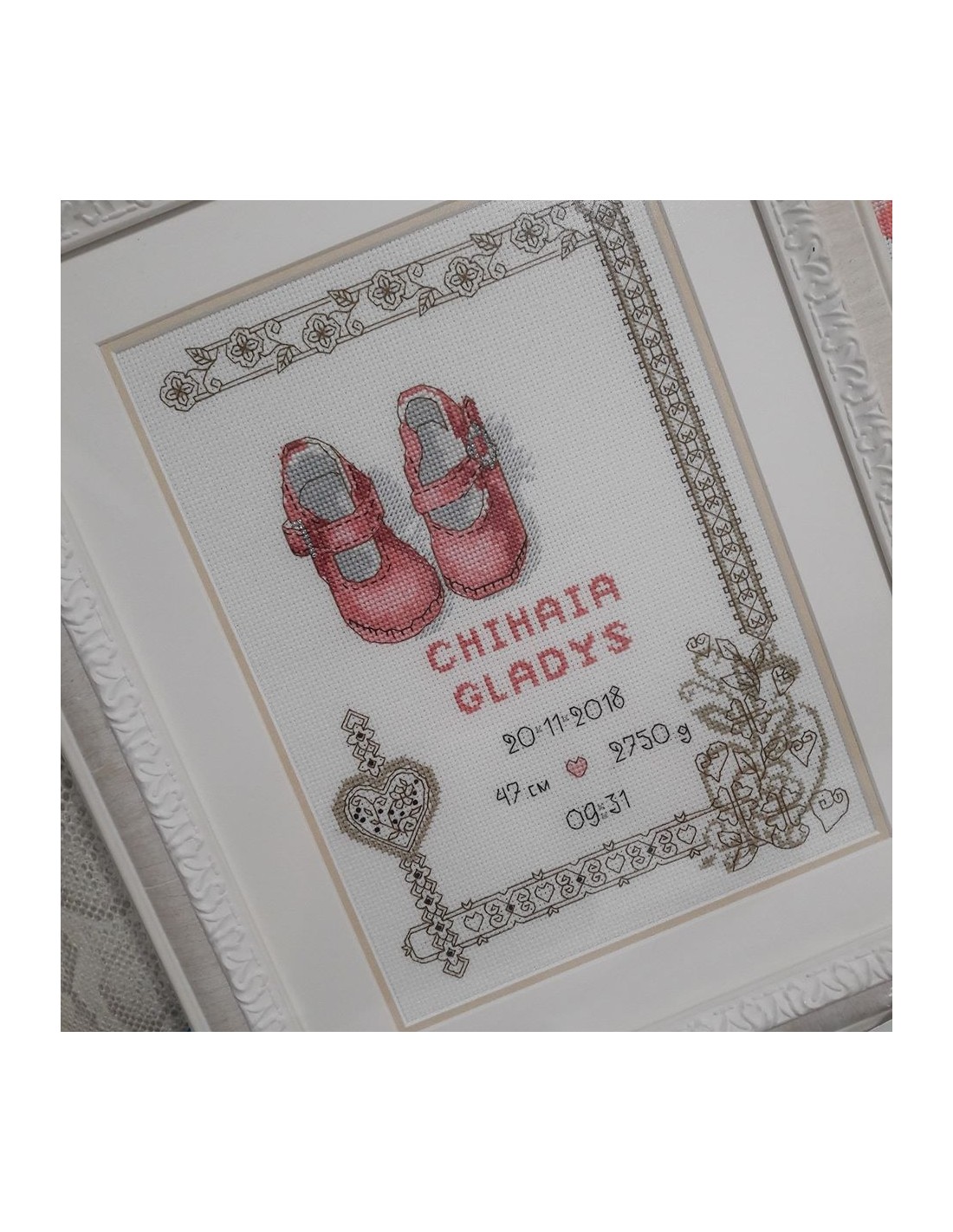Tabloul este personalizat prin brodare manuală cu datele solicitate (data de naștere, ora, greutatea bebelușului, înălțime etc).