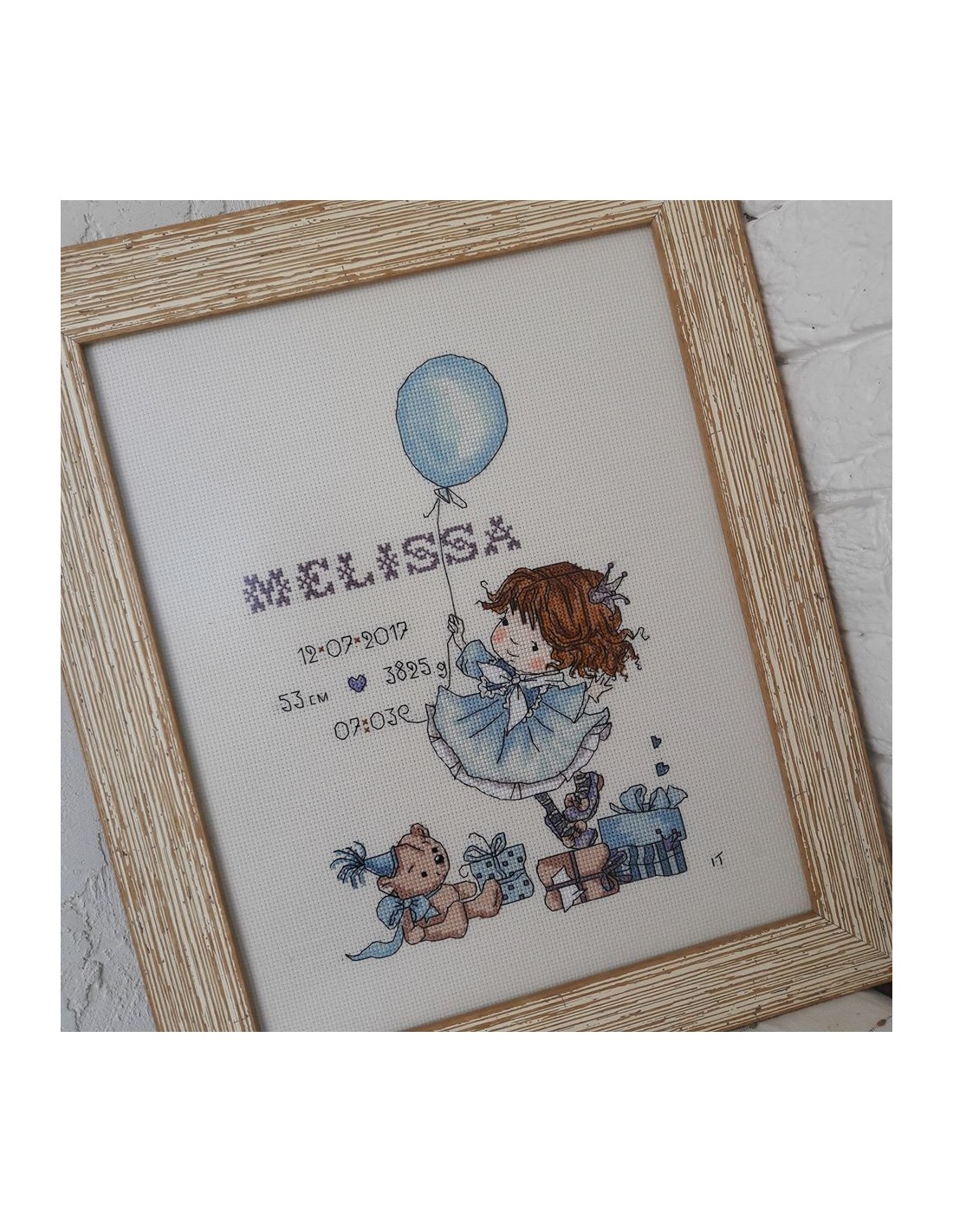 Tabloul este personalizat prin brodare manuală cu datele solicitate (data de naștere, ora, greutatea bebelușului, înălțime etc).