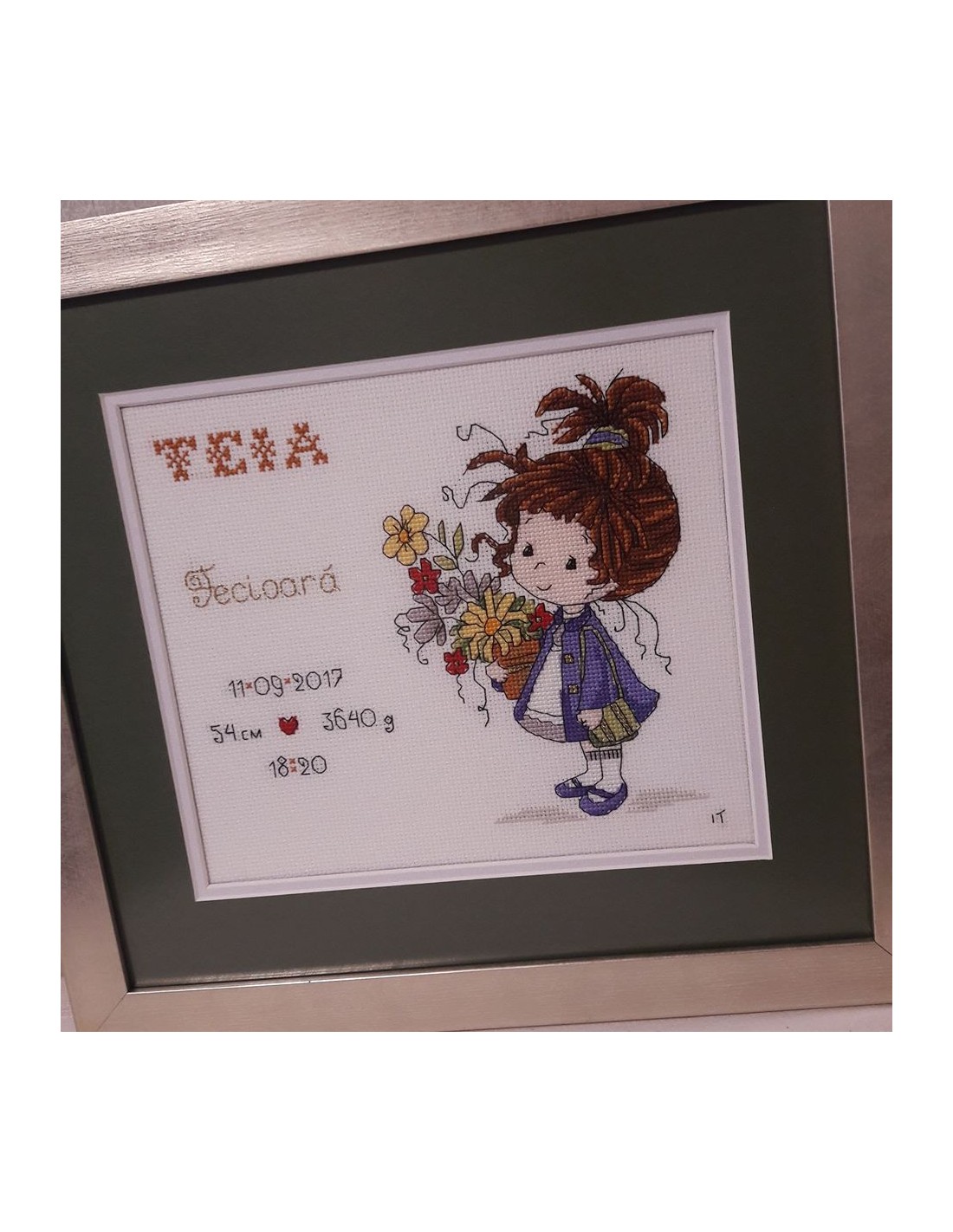 Tabloul este personalizat prin brodare manuală cu datele solicitate (data de naștere, ora, greutatea bebelușului, înălțime etc).