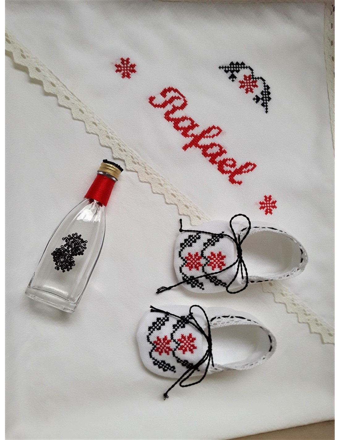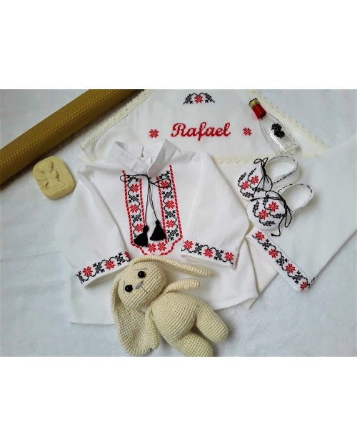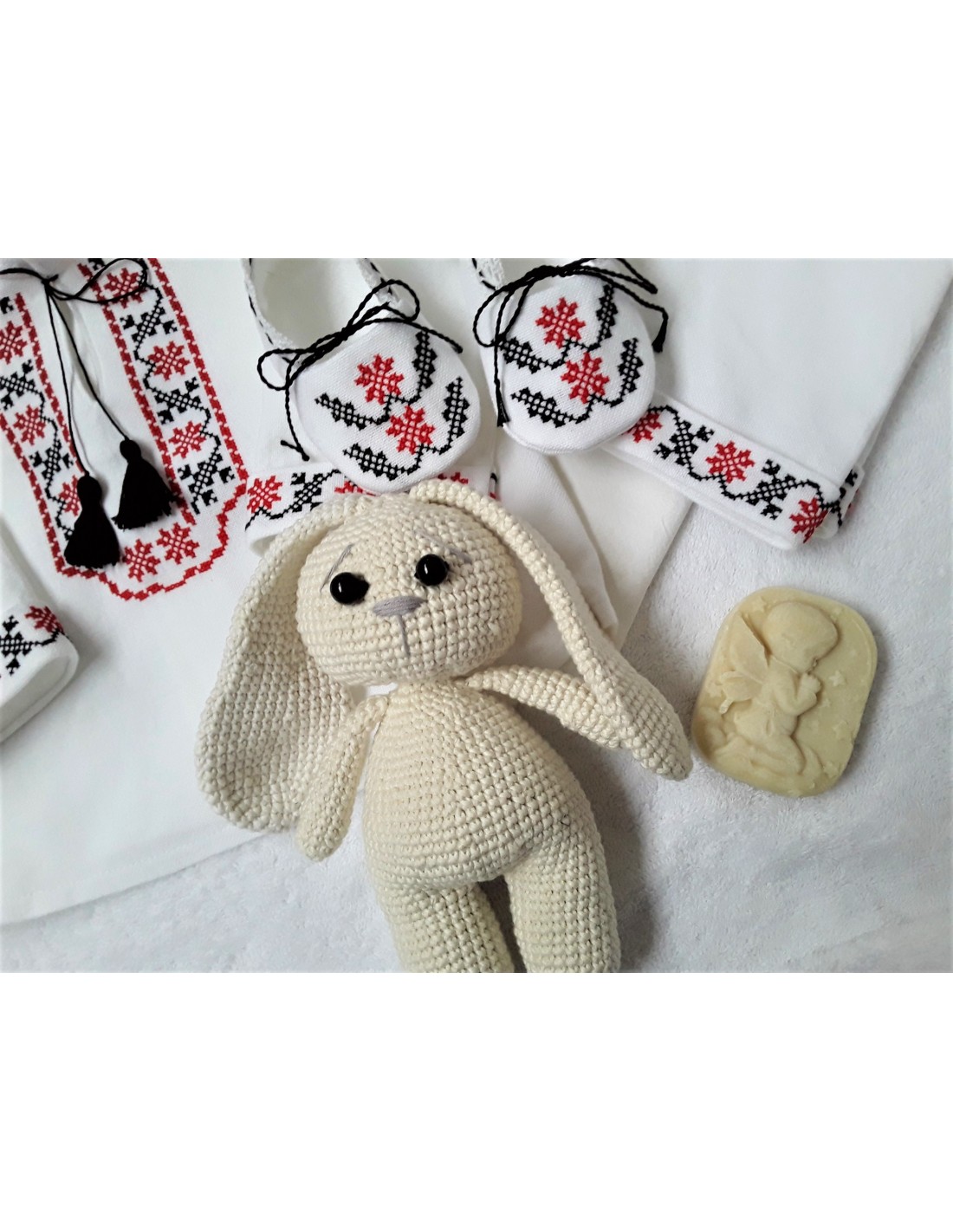Trusoul de botez e creat din pânză naturală, tradițională românească, sustenabilă, 100 % bumbac, prietenoasă ecosistemului și corpului bebelușului, antialergică și aerată care lasă pielea să respire. Trusoul include: prosopul bebelușului, pânza de mir și străițele: cămașa, pantaloni, botoșei precum și jucăria croșetată. Toate articolele sunt personalizate cu informațiile solicitate.