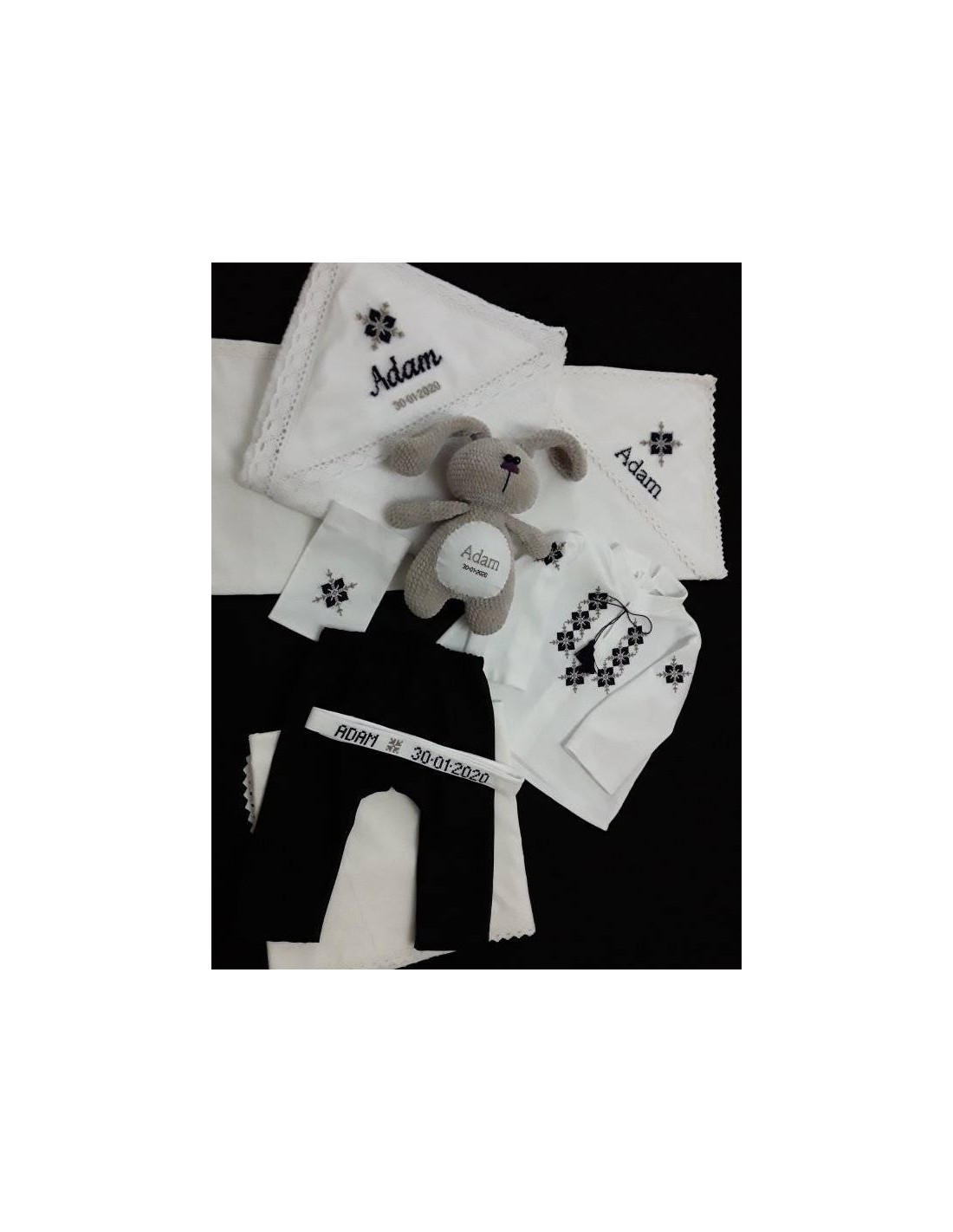 Trusoul de botez e creat din pânză naturală, tradițională românească, sustenabilă, 100 % bumbac, prietenoasă ecosistemului și corpului bebelușului, antialergică și aerată care lasă pielea să respire. Trusoul include: prosopul bebelușului, pânza de mir, fașă, săculeț pentru săpun, jucărie personalizată și străițele: cămașă, pantaloni, botoșei. Fiecare articol din componența setului poate fi achiziționat separat.