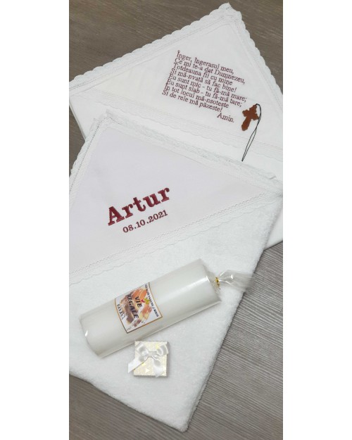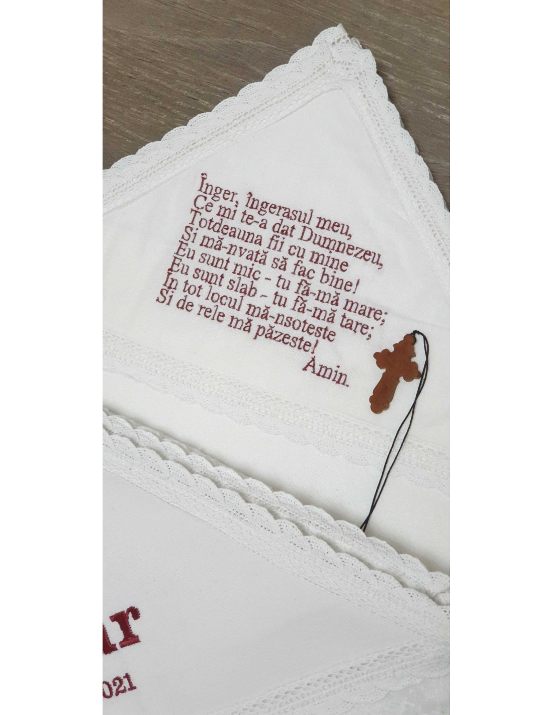 Trusoul de botez e creat din pânză naturală, 100 % bumbac. Trusoul include: prosopul bebelușului, pânza de mir, Toate articolele sunt personalizate conform solicitării.