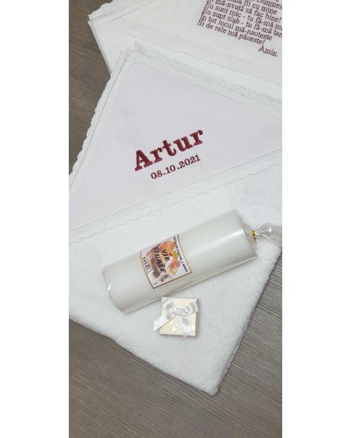 Fiecare articol din componența setului poate fi achiziționat separat. Poate fi personalizat și completat cu alte articole: străițe de botez (cămășuță, pantaloni, botoșei), prosop pentru preot, săculeț pentru săpun, fașa, etc.
