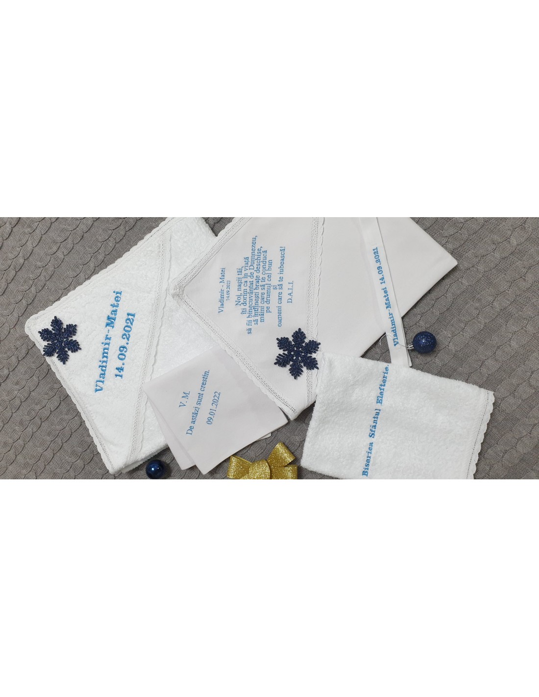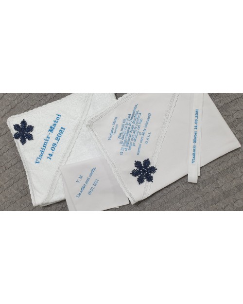 Fiecare articol din componența setului poate fi achiziționat separat. Poate fi personalizat și completat cu alte articole: străițe de botez (cămășuță, pantaloni, botoșei) sau alte articole.