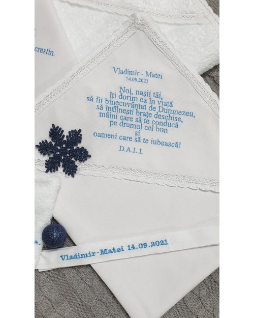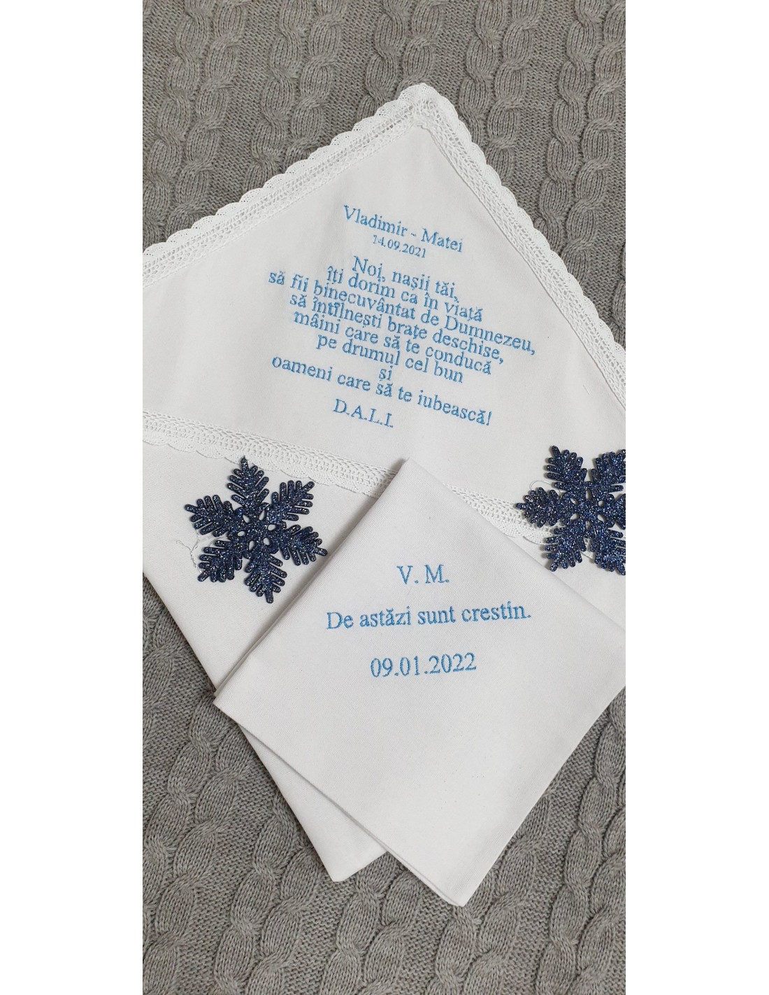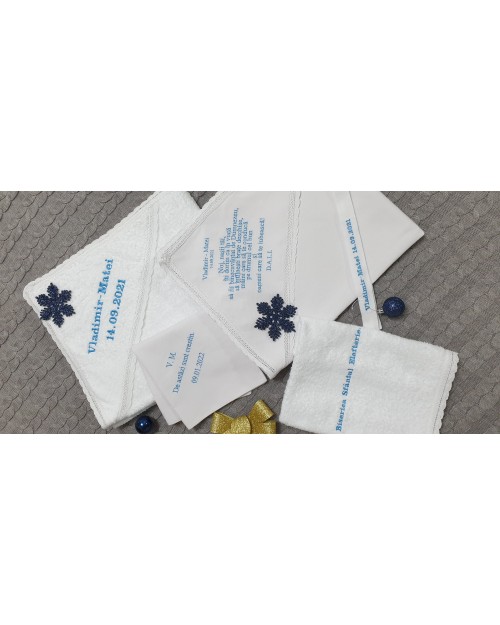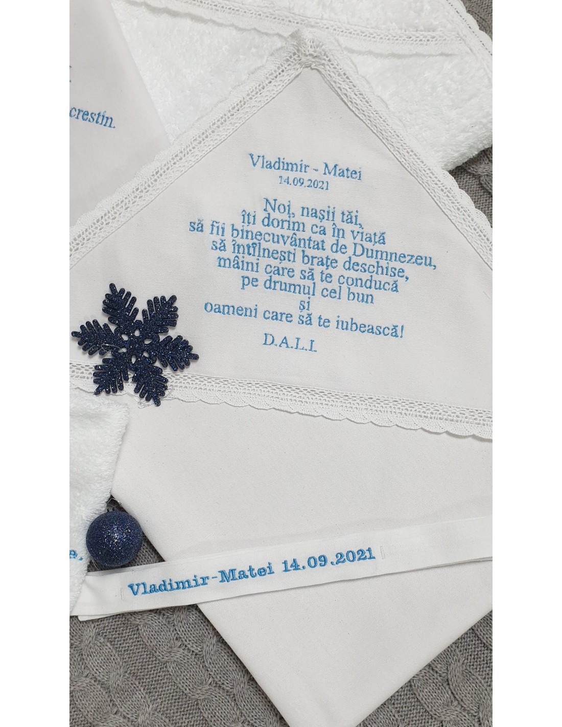 Trusoul de botez e creat din pânză naturală, tradițională românească, sustenabilă, 100 % bumbac, prietenoasă ecosistemului și corpului bebelușului, antialergică și aerată care lasă pielea să respire. Trusoul include: prosopul bebelușului, pânza de mir, fașa, prosop preot, batista. Toate articolele sunt personalizate cu informațiile solicitate.